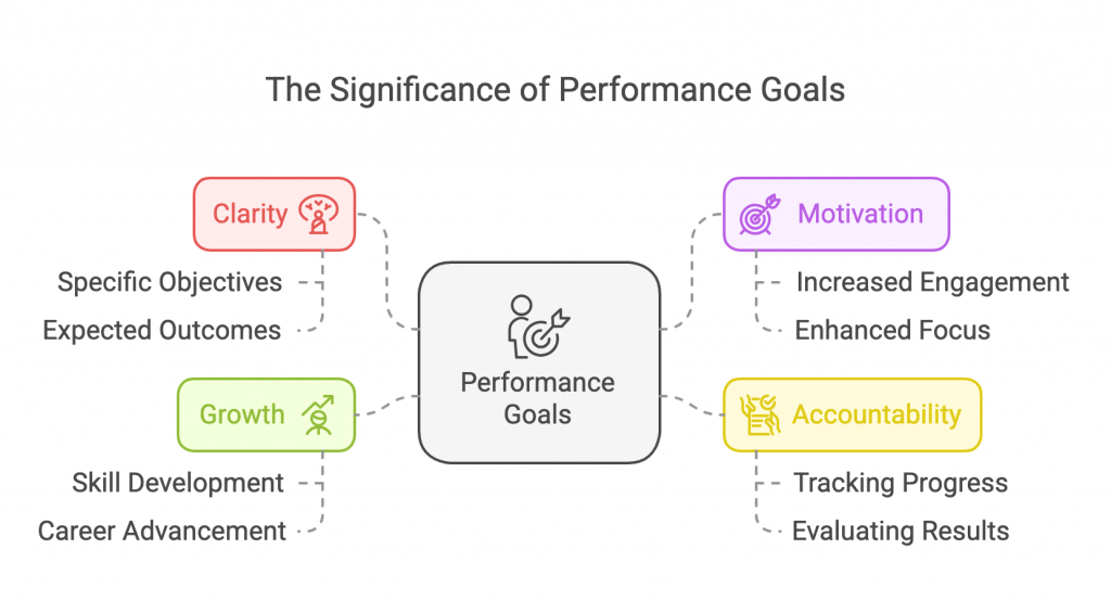 Performance goals are specific, measurable objectives that help you focus on what matters most in your job. They’re not just about hitting targets—they’re about growing, improving, and aligning your efforts with your company’s mission. Think of them as your personal roadmap to success.